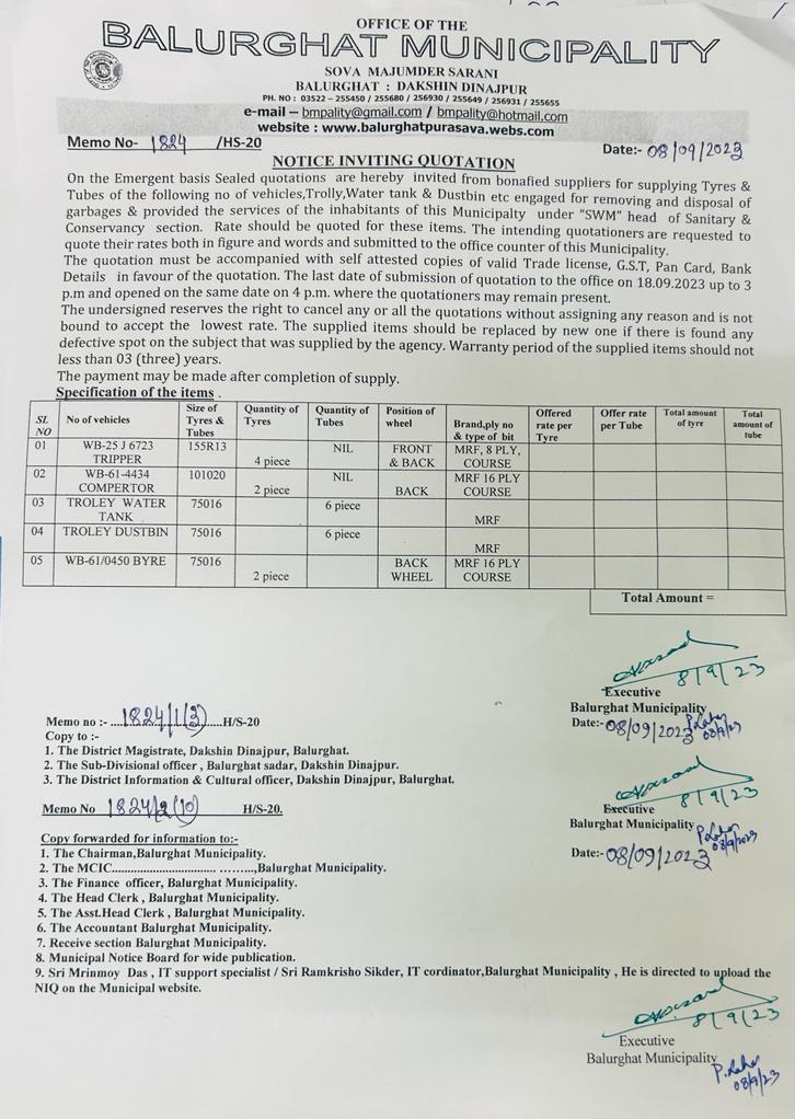 Memo No. 2075/HS-20 Dt. 04.09.2025 Procurement of vehicle parts at SWm Head under Balurghat Municipality