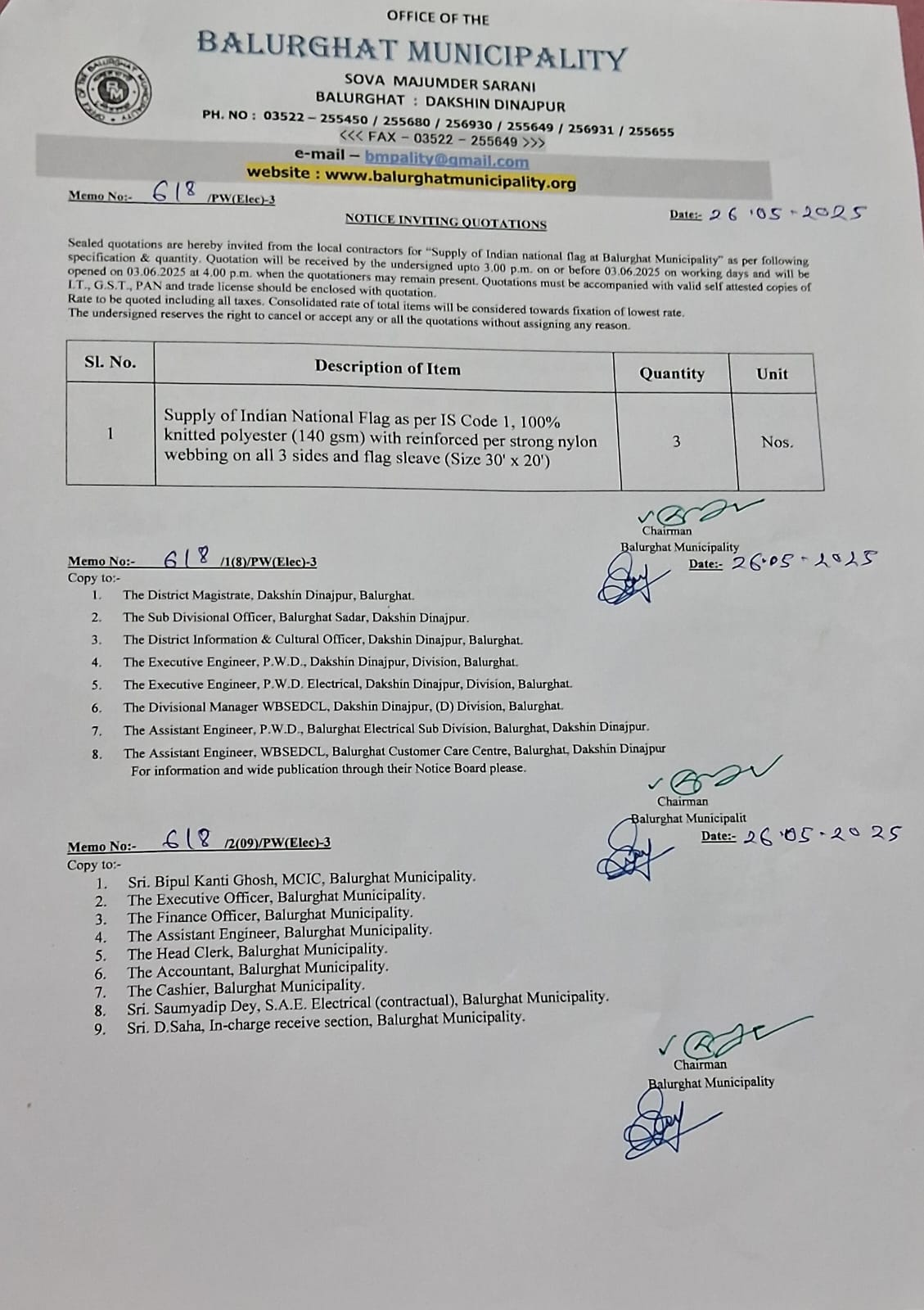 Memo No. 618/PW(Elect)-3 Dt. 26.05.2025, Supply of Indian National Flag under Balurghat Municipality