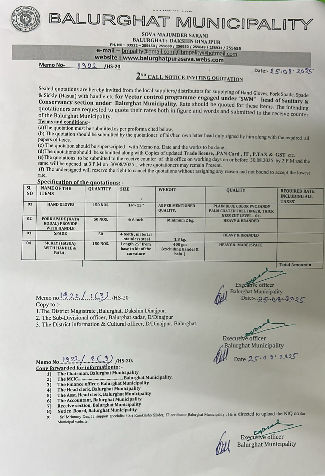 NIQ for Supplying of Hand Gloves, Fork Spade, Spade & Sickly (Hasua) for VCP ( SWM ) under Balurghat Municipality, Memo. 1638/HS-20 dt. 07.08.2025